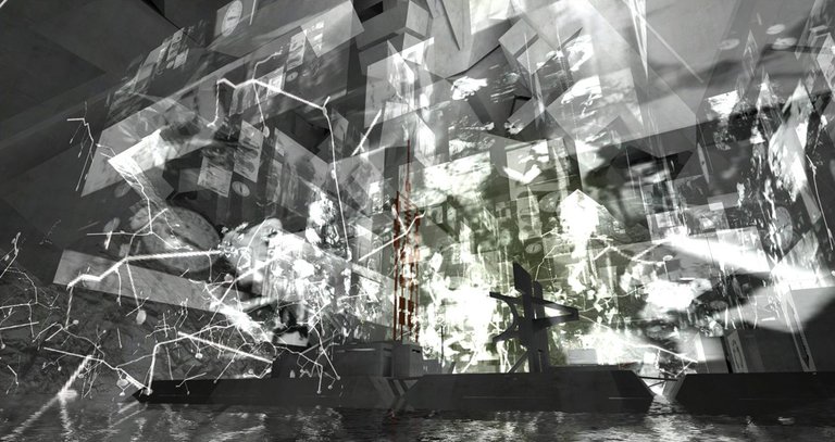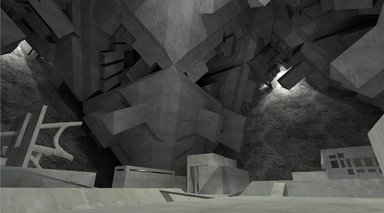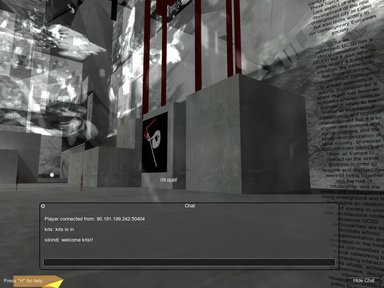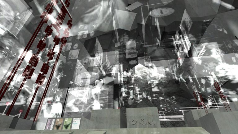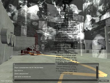 A 3D multi-users environment inspired by the Sierpinski Pyramid and developed using Parametric and procedural architecture principles. It's a space where the past, presented as video archive samples, is interlaced with visions of the being immured in the contemporary media society. It’s a tango between lights and shadows which are crossing the small apertures of nowadays social bunkers. You can there use different collaborative tools, like a chat, a painting tool, a drawing trajectories tool, shared text boards and more…