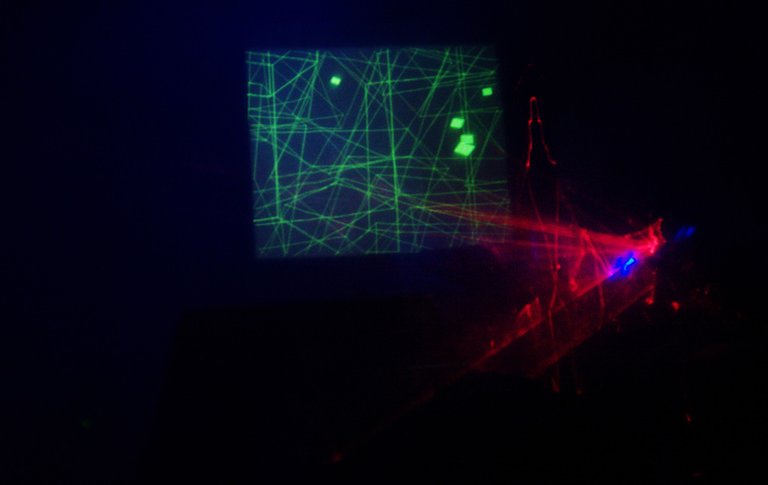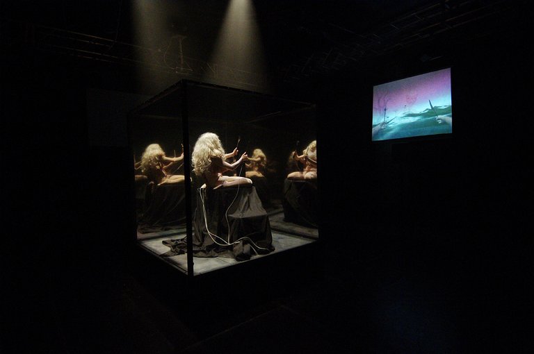 Inside the cube a light turns on and off; when the light is turned on, a woman is visible through the cube's mirrored, translucent walls. Her face hidden behind long hair, she crouches on a table and, holding a fork and knife, makes jagged movements with her arms. The cutlery is connected by wires to a computer and with it she can direct the aural environment and images on the screens; as her movement becomes more aggressive, pulsating, artificial sounds cut violently into the room. Unbeknownst to the spectators, they too determine the course of the performance: A sensor responding to the audience's physical movements controls the light inside this "cage'' while also affecting the ambient noise and projected imagery.